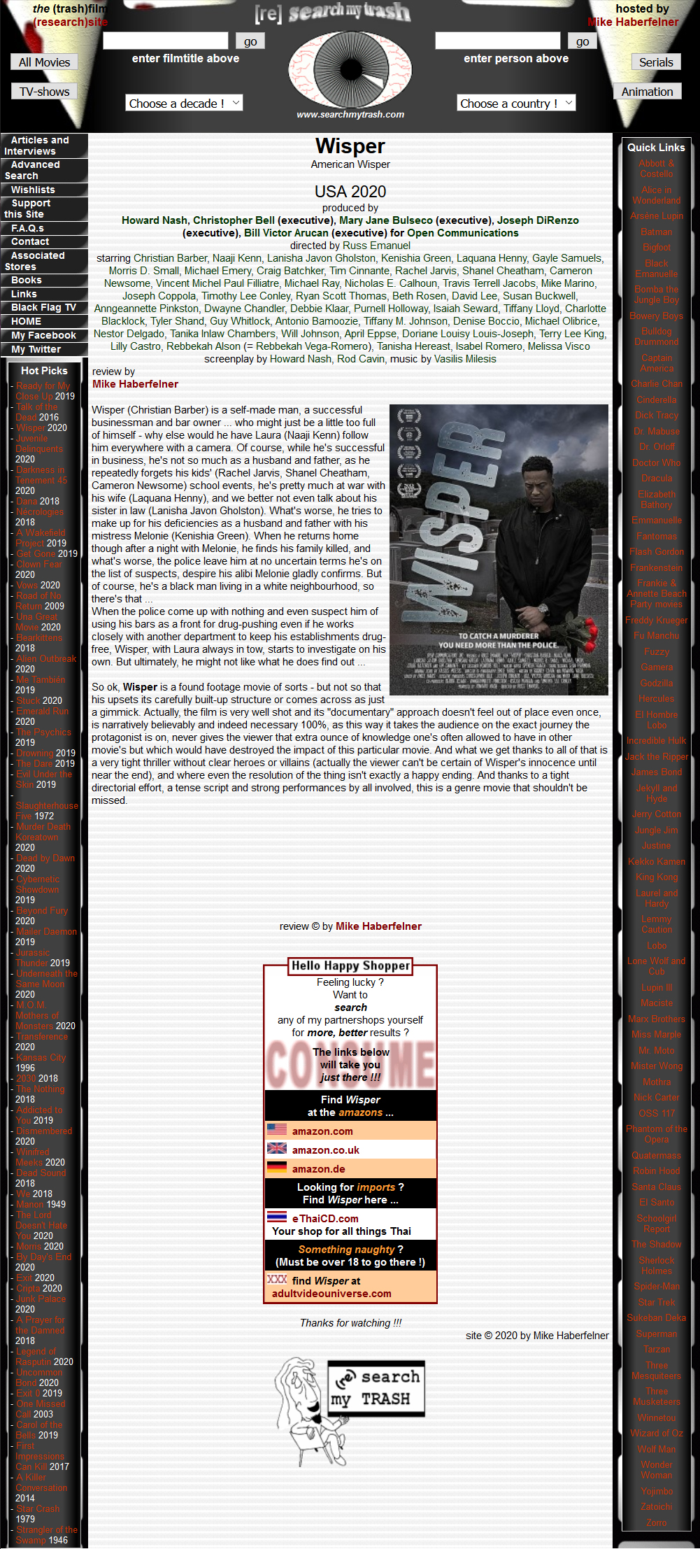 Wisper Poland Premiere at the East Europe International Film Festival - Best Film, Best Lead Actor (Christian Barber), Best Supporting Actress (Lanisha Javon Gholston), Best Hair Make-Up & Body Design, Best Editing Of A Feature Film, Best Cinematography In A Feature Film, Best Director Nominations.