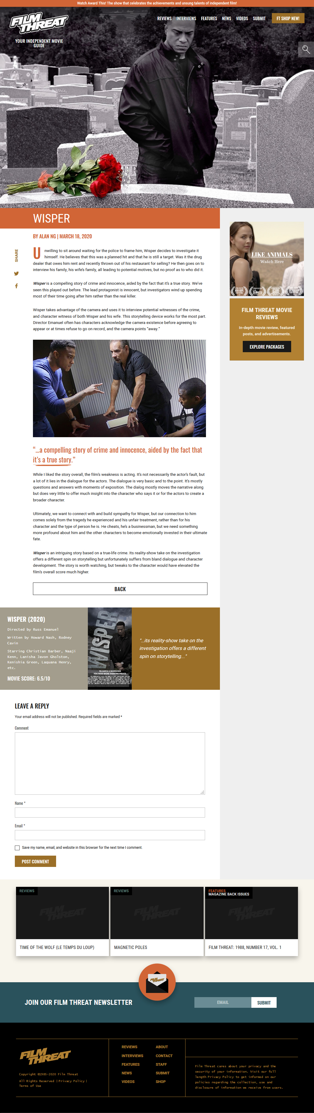 Wisper Southern Premiere at the Bare Bones International Film & Music Festival - Best Thriller: First Place, Clu Gulager's Best Lead Actor (Christian Barber), Ford Austin Bare Bones Best (Male) Director Winner, Best Produced Film Nomination.