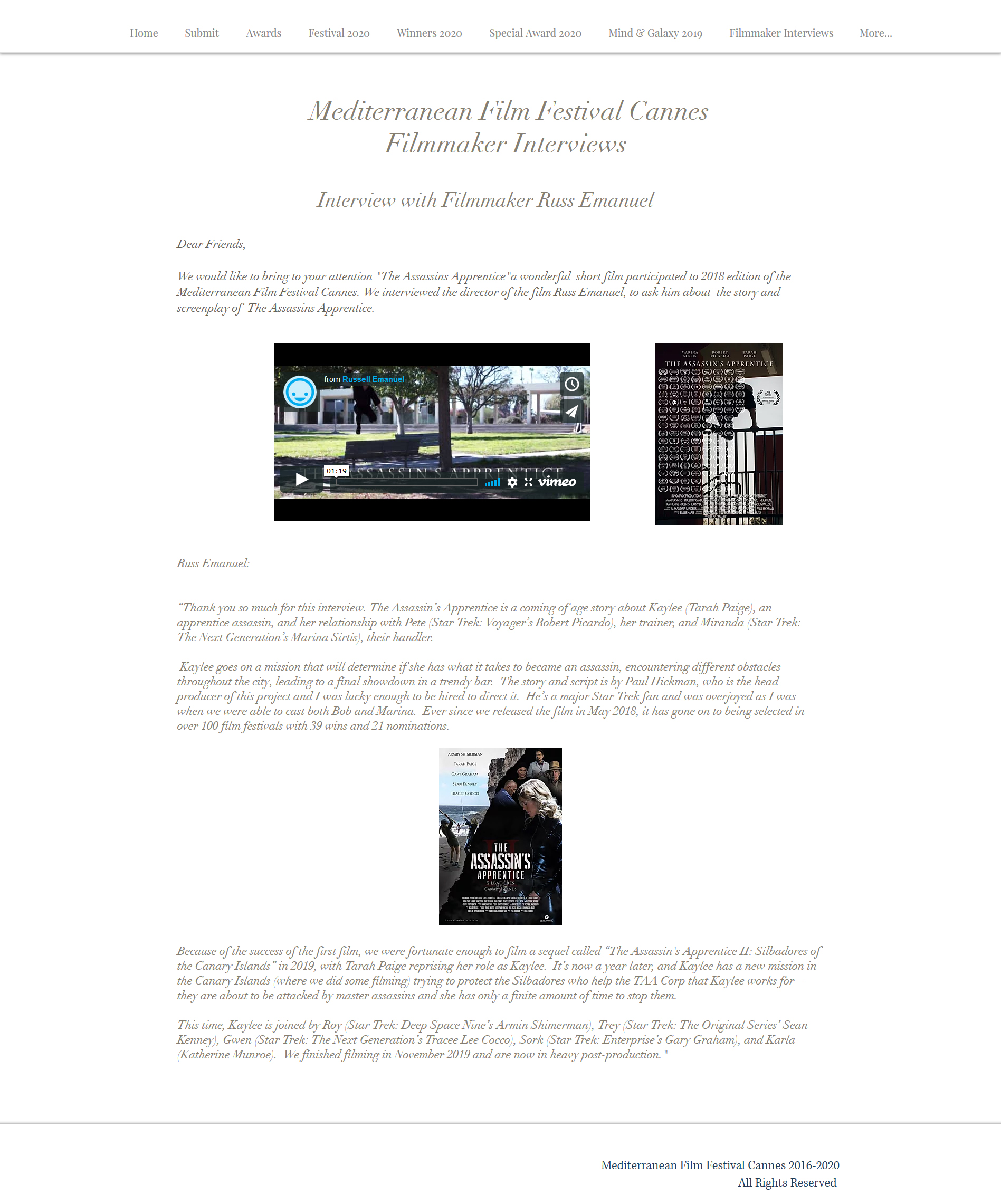 The Assassin's Apprentice Poland Premiere at the East Europe International Film Festival - Best Supporting Actress In A Short Film (Marina Sirtis) Winner, Best Lead Actress In A Short Film (Tarah Paige), Best Lead Actor In A Short Film (Robert Picardo), Best Editing Of A Short Film, Best Director Of A Short Film Nominations.