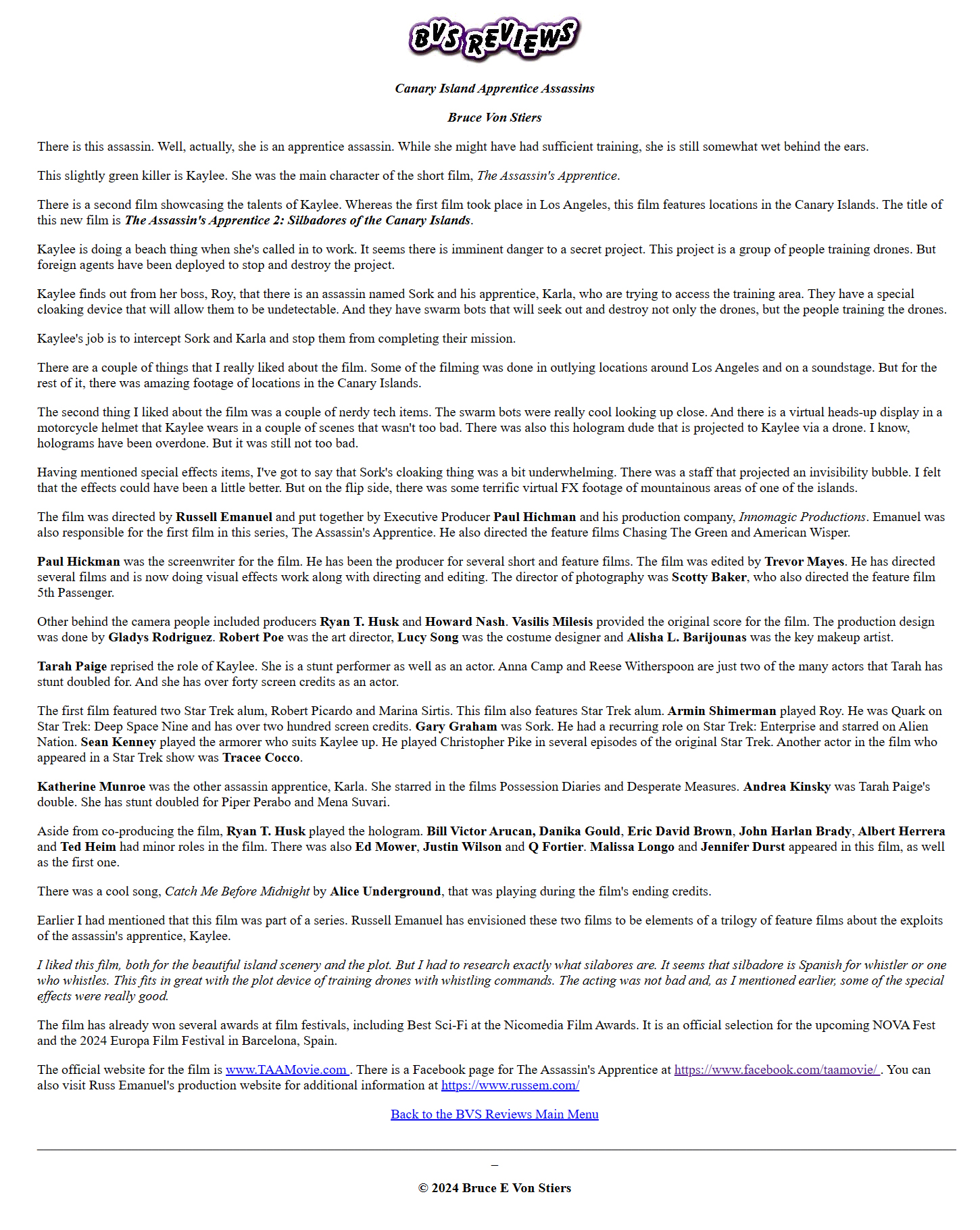 The Assassin's Apprentice: Silbadores of the Canary Islands Official Selection at the Moonwhite Films International Film Fest - Best Director, Best Actress (Tarah Paige), Best Actress Supporting Role (Katherine Munroe) Winner, Best Actor Supporting Role Nomination.
