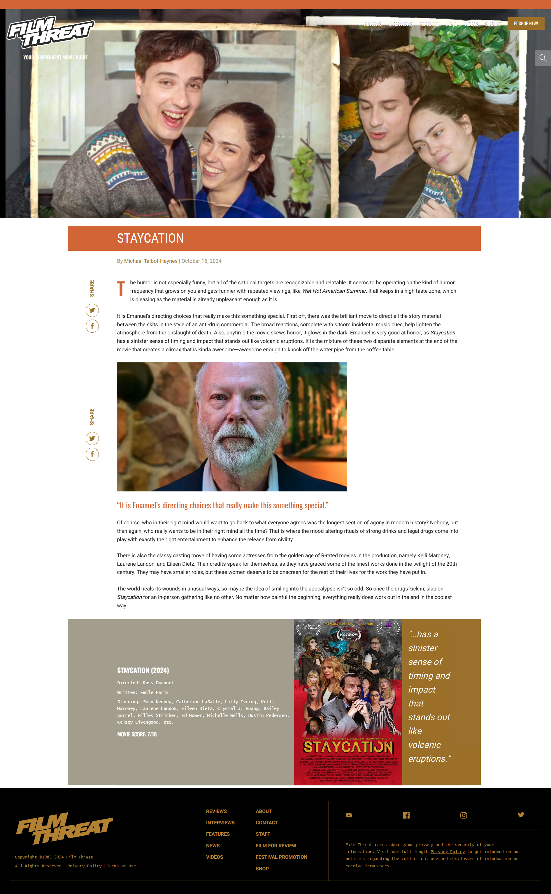 Michael Talbot-Haynes of Film Threat writes a Staycation review.